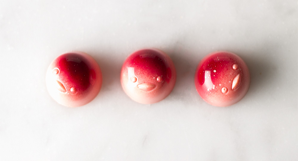 Temperera färgblommorna med 1 tsk smält kakaosmör. Airbrusha halva facken. Låt färgen torka i 30 minuter innan skalen gjuts i tempererad Callebaut Strawberry som förtunnats med kakaosmör.