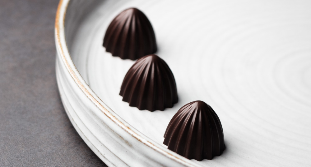 I den här pralinen kombineras yuzu som smakar grapefrukt och mandarin med en mörk bourbonganache. Pralinskalet framställs i den snygga svarta chokladen, Carma Black Zabuye.