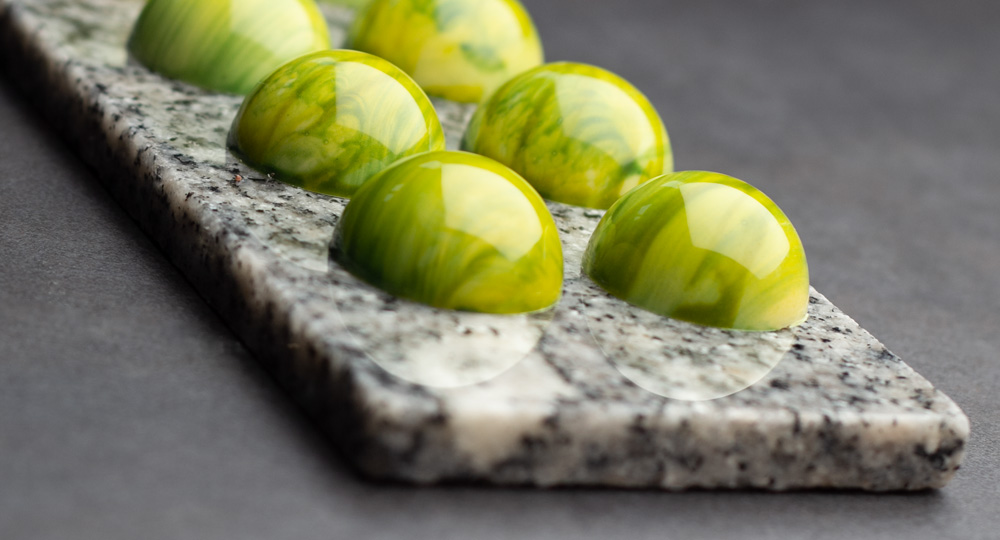 Blanda ljusgrönt på mattan av 3/4 gul blomma, 1/4 blå blomma och 1 tsk kakaosmör. Måla lite tjockare ränder med en akvarellpensel i formen. Låt färgen torka i 30 minuter. Gjut sedan skal i tempererad, vit choklad.