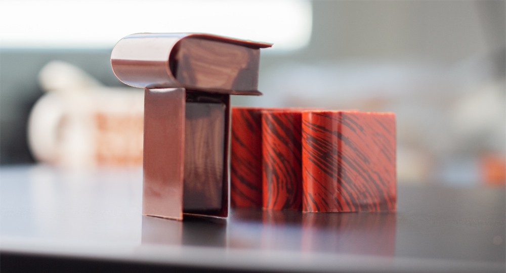 Smält kakaosmöret och blanda med kakaopulvret på en bakmatta. Måla ”boksidor” i formen med en akvarellpensel. Observera att enbart sidorna på pralinerna behöver målas.