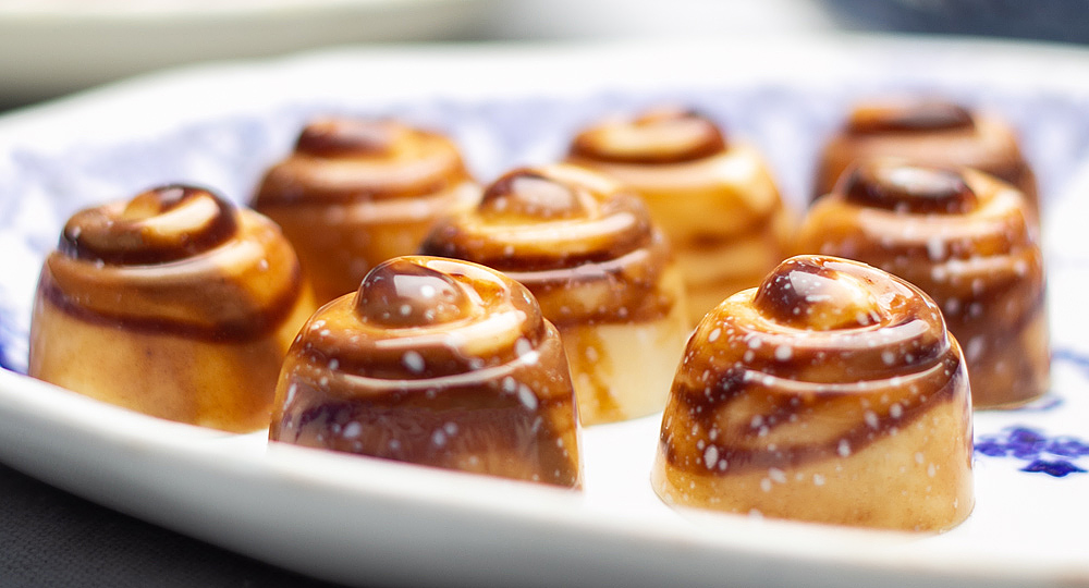 Dosera 1 msk kakaosmör och 1/2 msk ceylon kanel på bakmattan. Jobba ihop färgen med ett finger. Fingermåla en gyllenbrun fond i form. Måla även i virveln med bomullspinne. Låt torka i 30 minuter innan skalen gjuts.
