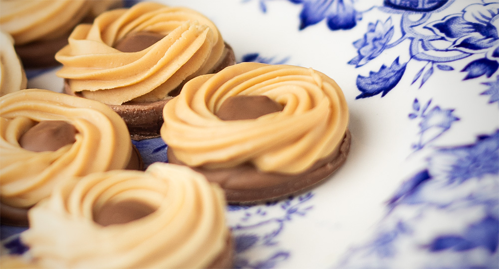 Dessa små söta praliner poppar verkligen i fikaasken! Kakorna består av tre komponenter: en botten i ljus choklad, en nougat och en spritsad krans i karamelliserad vit choklad.
