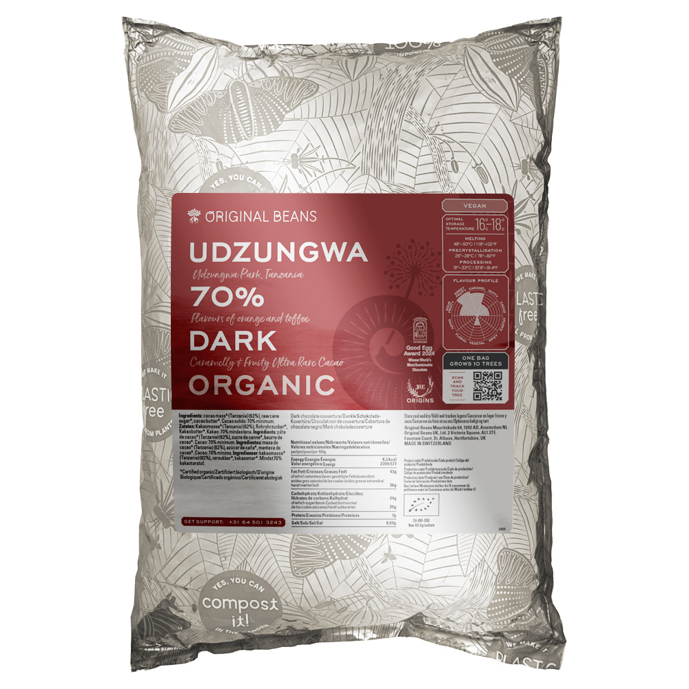 Udzungwa är en ekologisk mörk couvertyr framställd av mycket ovanliga trinitariobönor från Udzungwa Park i Tanzania. Den har en lekfull smakprofil med toner av apelsin och toffee. Tillverkas i Schweiz av Max Felchlin AG.